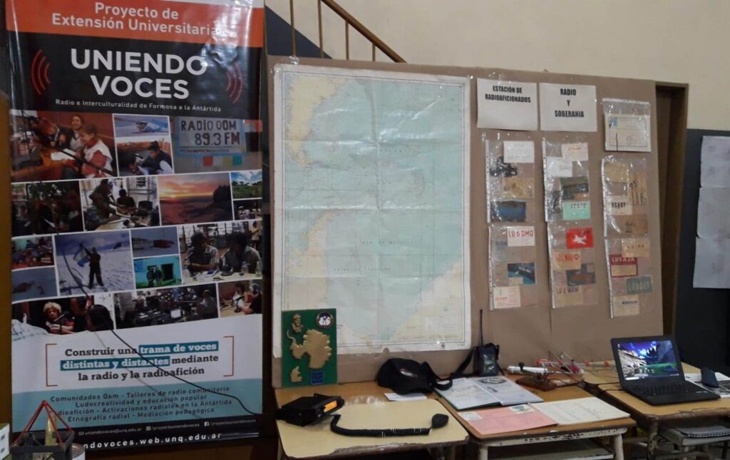Los días 14 y 15 de noviembre pasados, durante la 33ª Exposición anual de Proyectos organizada por la EEST Nº 7 “Taller Regional Quilmes”, el director del Proyecto de Extensión Universitaria “Uniendo Voces” (PEU-UV) de la UNQ, participó presentando charlas abiertas a la comunidad sobre “Radio, Radioafición y Soberanía en Antártida: un Desafío Permanente”. El especialista Juan C. Benavente, director de UV, ex alumno de esa escuela y con experiencia antártica en temas de radio y soberanía, tuvo un espacio para armar una exhibición sobre Radio y Antártida, en la que se instalaron equipos radioeléctricos personales, se efectuaron demostraciones de operación radial, a la vez que se extendieron mapas del sexto continente, tarjetas históricas de confirmación de contactos de radio (QSL), antenas y accesorios de radio. Se explicó al público conceptos de radio y su importancia en la Antártida.